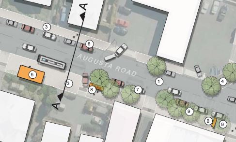 • Increased footpath space on the southern side of Augusta Road to provide a people focussed space