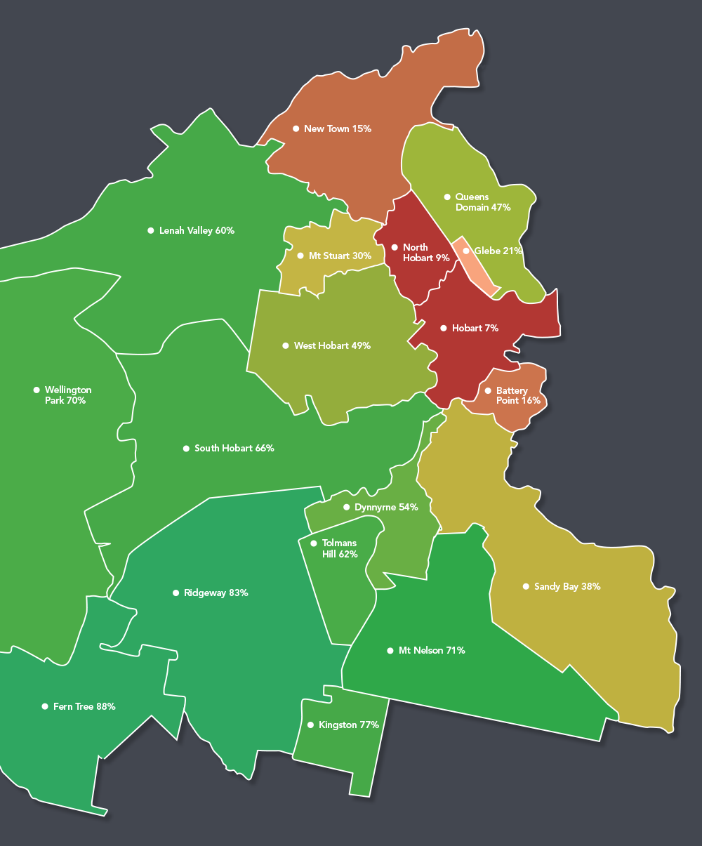 Above: Percentage of canopy cover by suburb in Hobart, 2022